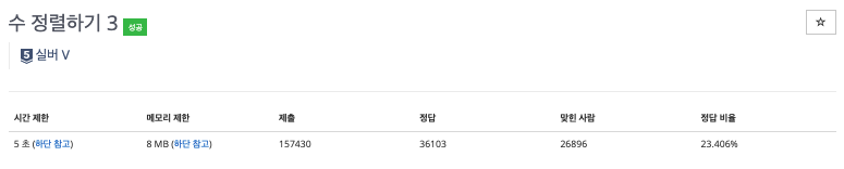 수 정렬하기 2는 메모리 제한이 256MB이었던것에 비해, 3에서는 8MB밖에 주어지지 않기 때문.