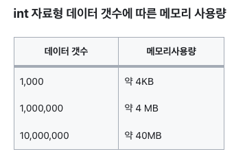 위 사진을 참고해보면, 사이즈가 10,000,000인 배열은 무려 40MB의 메모리나 사용한다는 것을 알 수 있다.