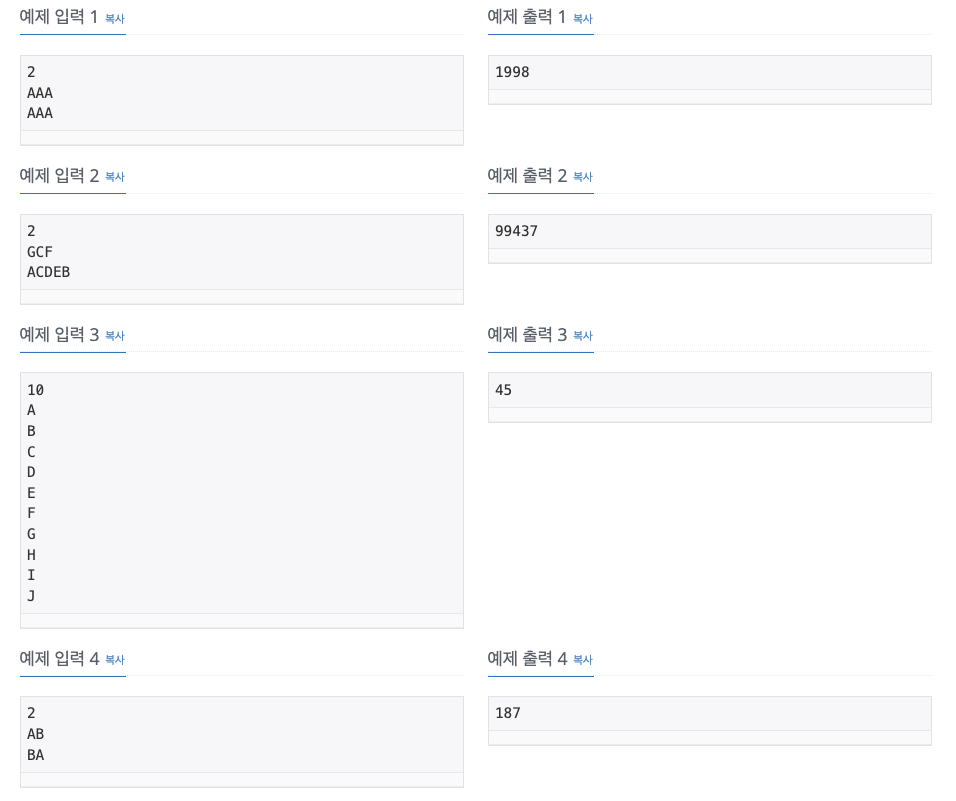첫째 줄에 단어의 개수 N(1 ≤ N ≤ 10)이 주어진다. 둘째 줄부터 N개의 줄에 단어가 한 줄에 하나씩 주어진다. 단어는 알파벳 대문자로만 이루어져있다. 모든 단어에 포함되어 있는 알파벳은 최대 10개이고, 수의 최대 길이는 8이다. 서로 다른 문자는 서로 다른 숫자를 나타낸다.