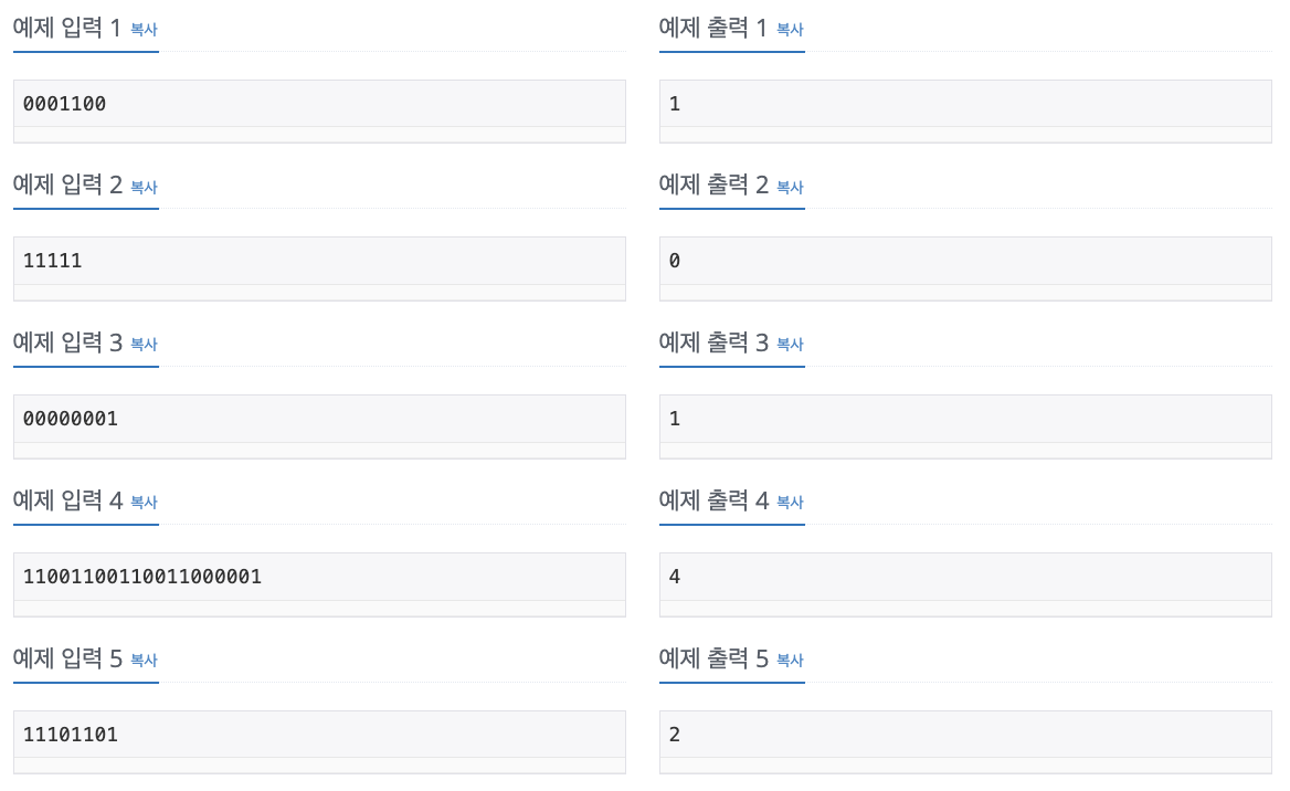 - 0과 1중 연속되는 개수가 적은게 답이다.