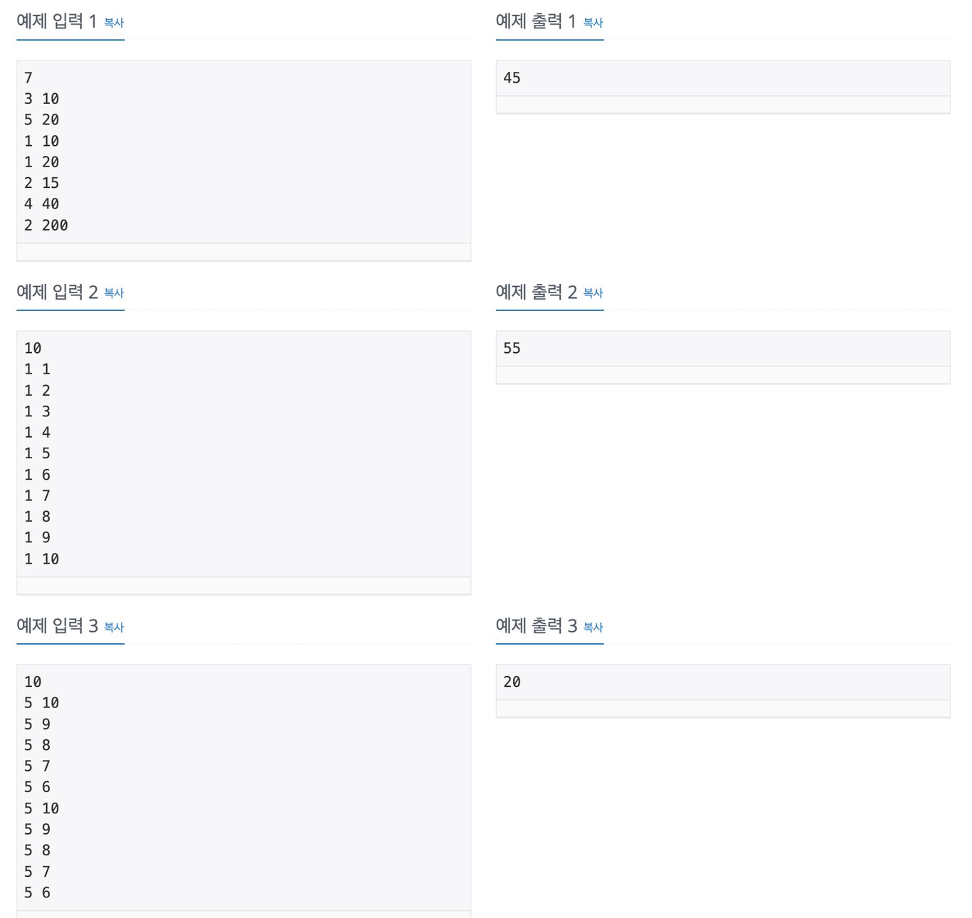 둘째 줄부터 N개의 줄에 Ti와 Pi가 공백으로 구분되어서 주어지며, 1일부터 N일까지 순서대로 주어진다. (1 ≤ Ti ≤ 5, 1 ≤ Pi ≤ 1,000)