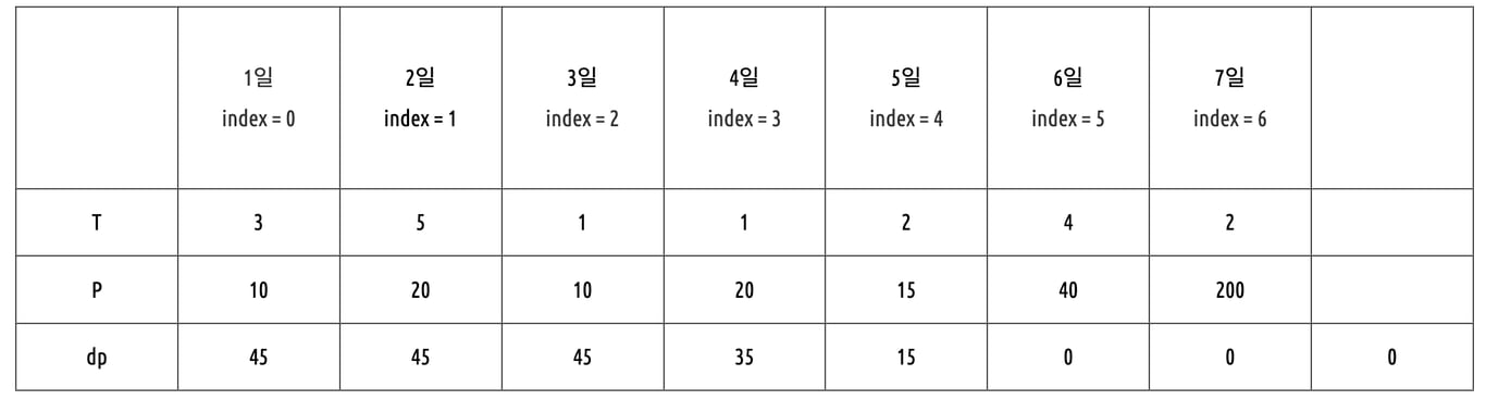 - DP의 각 원소는 해당 날짜 (index)에서부터 퇴사날까지 받을 수 있는 최대 이익이다.
