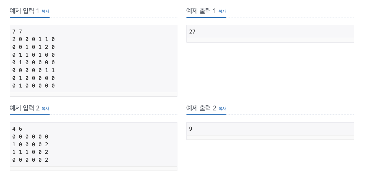 연구소는 크기가 N×M인 직사각형으로 나타낼 수 있으며, 직사각형은 1×1 크기의 정사각형으로 나누어져 있다. 연구소는 빈 칸, 벽으로 이루어져 있으며, 벽은 칸 하나를 가득 차지한다.