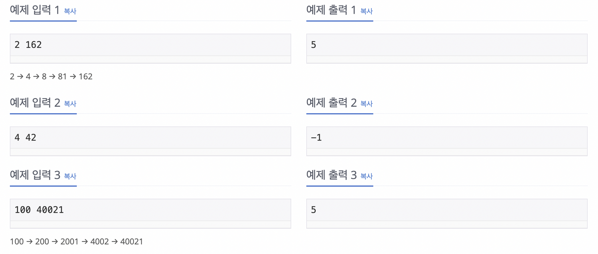 A를 B로 바꾸는데 필요한 연산의 최솟값에 1을 더한 값을 출력한다. 만들 수 없는 경우에는 -1을 출력한다.