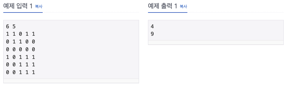 첫째 줄에 도화지의 세로 크기 n(1 ≤ n ≤ 500)과 가로 크기 m(1 ≤ m ≤ 500)이 차례로 주어진다. 두 번째 줄부터 n+1 줄 까지 그림의 정보가 주어진다. (단 그림의 정보는 0과 1이 공백을 두고 주어지며, 0은 색칠이 안된 부분, 1은 색칠이 된 부분을 의미한다)