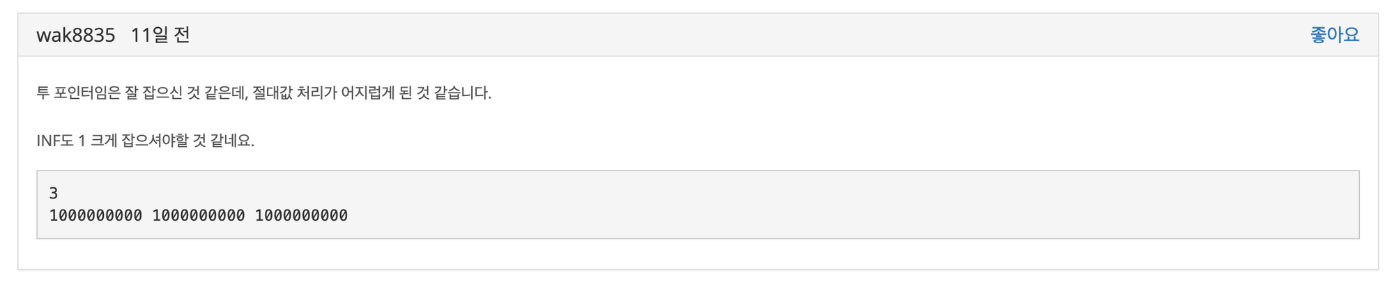 첫째 줄에는 전체 용액의 수 N이 입력된다. N은 2 이상 100,000 이하이다. 둘째 줄에는 용액의 특성값을 나타내는 N개의 정수가 빈칸을 사이에 두고 주어진다. 이 수들은 모두 -1,000,000,000 이상 1,000,000,000 이하이다. N개의 용액들의 특성값은 모두 다르고, 산성 용액만으로나 알칼리성 용액만으로 입력이 주어지는 경우도 있을 수 있다.