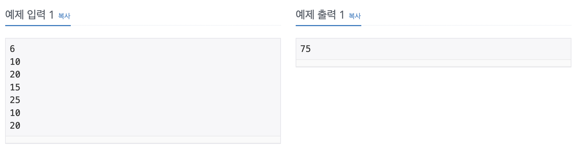 둘째 줄부터 한 줄에 하나씩 제일 아래에 놓인 계단부터 순서대로 각 계단에 쓰여 있는 점수가 주어진다. 계단의 개수는 300이하의 자연수이고, 계단에 쓰여 있는 점수는 10,000이하의 자연수이다.