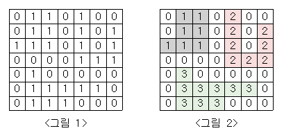 <그림 1>과 같이 정사각형 모양의 지도가 있다. 1은 집이 있는 곳을, 0은 집이 없는 곳을 나타낸다. 철수는 이 지도를 가지고 연결된 집의 모임인 단지를 정의하고, 단지에 번호를 붙이려 한다. 여기서 연결되었다는 것은 어떤 집이 좌우, 혹은 아래위로 다른 집이 있는 경우를 말한다. 대각선상에 집이 있는 경우는 연결된 것이 아니다. <그림 2>는 <그림 1>을 단지별로 번호를 붙인 것이다. 지도를 입력하여 단지수를 출력하고, 각 단지에 속하는 집의 수를 오름차순으로 정렬하여 출력하는 프로그램을 작성하시오.