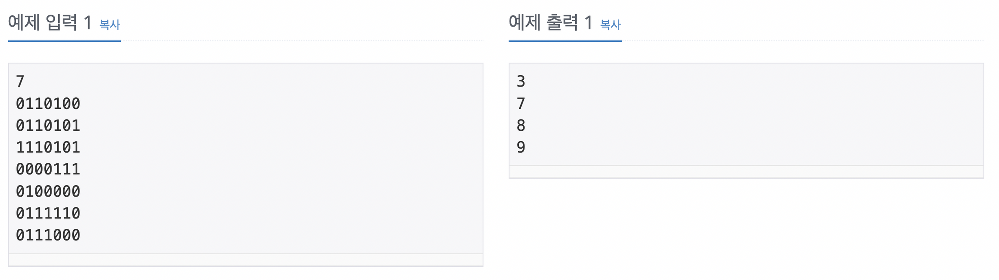 첫 번째 줄에는 지도의 크기 N(정사각형이므로 가로와 세로의 크기는 같으며 5≤N≤25)이 입력되고, 그 다음 N줄에는 각각 N개의 자료(0혹은 1)가 입력된다.