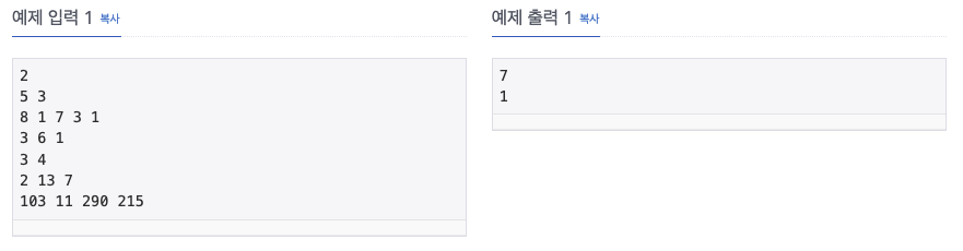 첫째 줄에 테스트 케이스의 개수 T가 주어진다. 각 테스트 케이스의 첫째 줄에는 A의 수 N과 B의 수 M이 주어진다. 둘째 줄에는 A의 크기가 모두 주어지며, 셋째 줄에는 B의 크기가 모두 주어진다. 크기는 양의 정수이다. (1 ≤ N, M ≤ 20,000)